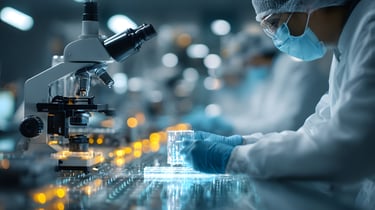 Lab technician wearing gloves and mask, inspecting peptide samples under bright light.